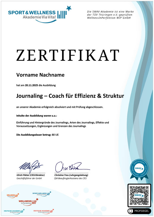 Journaling wird zunehmend im Coaching, in der psychologischen Beratung, im Stressmanagement und im Bereich Persönlichkeitsentwicklung eingesetzt. Der SWAV-Kurs führt Sie schrittweise in diese Methoden ein und legt besonderen Wert auf fachliche Korrektheit, klare Struktur und praxisnahe Umsetzung.