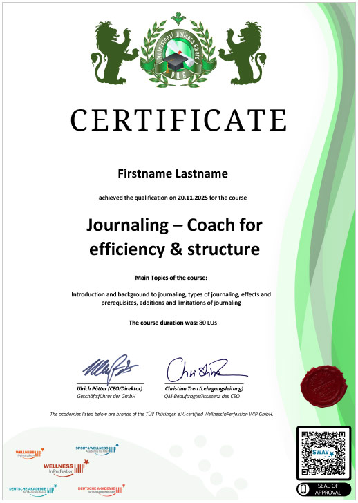 Sie können die JOURNALING-Ausbildung jederzeit beginnen und haben dafür maximal 12 Monate Zeit. Der Kurs kann bereits innerhalb eines Tages abgeschlossen werden, wenn Sie täglich etwa 6-8 Stunden investieren. Wenn Sie alle Lektionen absolviert haben, können Sie sich für die Online Abschlussprüfung anmelden. Nach Bestehen der Abschlussprüfung beantragen Sie Ihre beiden Digital-Zertifikate (deutsch und englisch). Das Deutsche Zertifikat und das Englische Certificate (PWA - Professional Wellness Award) sind direkt als Download (PDFs) verfügbar und im Preis schon inkludiert. Für einmalige 49,95 EUR können die beiden dazugehörigen physischen Zertifikate auf echtem Kartondruck (signiert) erworben werden - diese werden dann direkt nach Zahlungseingang via DHL an Sie ausgeliefert.